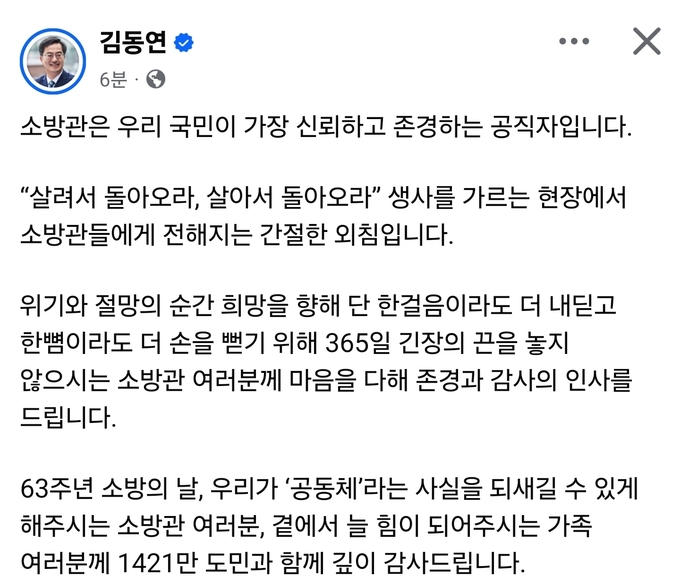 그러면서 김 지사는 “63주년 소방의 날, 우리가 ‘공동체’라는 사실을 되새길 수 있게 하는 소방관 여러분, 곁에서 늘 힘이 돼주는 가족 여러분에게 1421만 도민과 함께 깊이 감사드린다”고 덧붙였다.