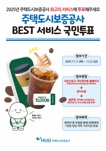 주택도시보증공사(HUG)가 11일부터 21일까지 ‘2025년 CS 우수사례 국민투표(대국민 선호도 조사)’를 진행한다.