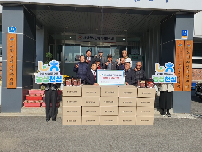 농협가평군지부는 11일 대한노인회 가평군지회을 방문해 지역어르신들의 건강증진과 행복한 노후지원을 위해 2000만 원 상당의 홍삼꾸러미를 전달했다.