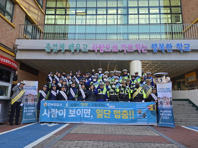 하남경찰서 지난 11일 풍산초등학교 앞에서 등굣길 학생들의 안전한 보행 환경을 조성하기 위해 교통안전 캠페인을 펼쳤다.