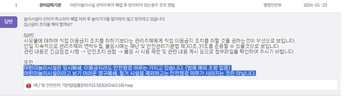 문제는 임시폐쇄 상태 놀이시설이 안전점검 의무 대상이라는 점이다. 행안부의 공식 문서(놀이시설 운영여부 구분)에도 임시폐쇄 상태의 어린이 놀이시설은 안전점검 의무가 있다고 명시돼 있는 것으로 확인됐다. 즉, 법이 적용되지 않는 시설이면서도 법적으로는 반드시 점검을 진행해야 하는 모순적인 상황인 셈이다.