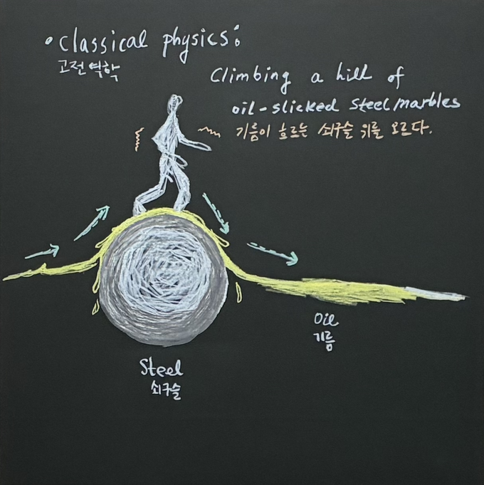 류혜두 작가는 설명하기 어려운 개념을 사유하려는 갈망에서 출발해, 역설적 준물리 공식과 시각적 언어로 사유의 과정을 풀어낸다.