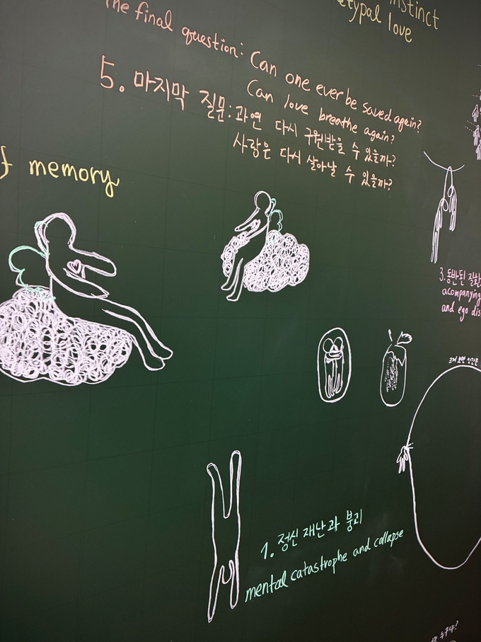 이를 칠판 연구 드로잉, 영상 그래프, 도해 작업 등을 통해 개념과 감정을 시각적으로 직조한다.