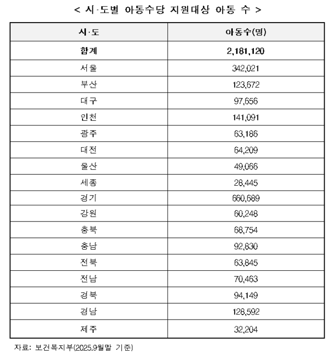 예산이 크게 늘어난 것은 ▲지급 대상 연령을 만 8세 미만(0〜7세)에서 만 9세 미만(0〜8세)으로 확대 ▲비수도권 아동 5000원, 인구감소지역 중 우대지역 아동 1만 원, 특별지역 아동 2만 원 ▲인구감소지역에서 지역화폐로 아동수당을 지급할 경우 1만 원을 각각 추가 지급함에 따른 것이다.