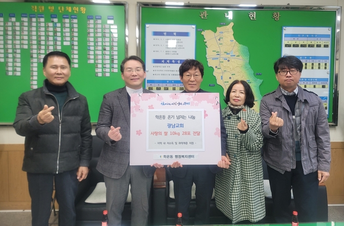 광명시 학온동 행정복지센터는 지난 18일 추수감사절을 맞아 학온동 광남교회로부터 교인들이 정성껏 모은 쌀 10kg들이 28포를 전달받았다.