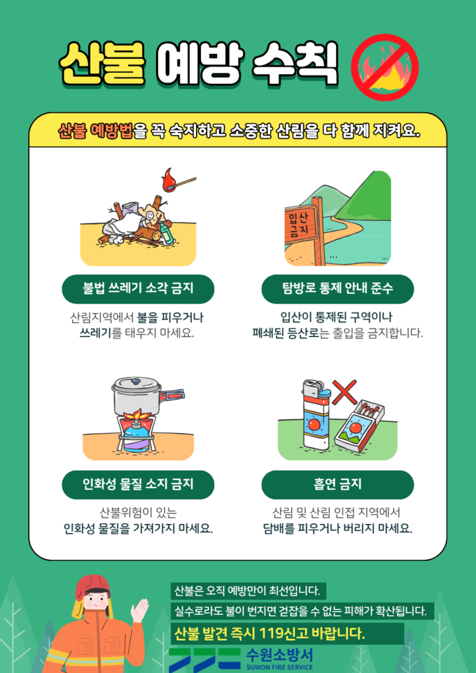 19일 수원소방서는 2025년 '산불조심 기간'에 맞춰 산불 예방과 신속한 대응에 대한 종합 대책을 추진한다고 밝혔다.