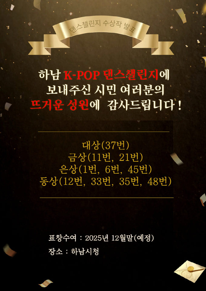시는 오는 12월 종무식에서 수상자에게 시장 표창을 수여하고 입상작 영상은 하남시 공식 유튜브에서 지속적으로 공개된다.