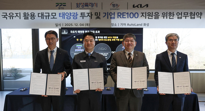 기아는 4일 경기 화성시 오토랜드 화성에서 경기도, 화성특례시, 한국자산관리공사(캠코)와 '국유지 활용 대규모 태양광 투자 및 기업 RE100(재생에너지 100% 사용) 지원을 위한 업무협약'을 맺었다고 밝혔다.