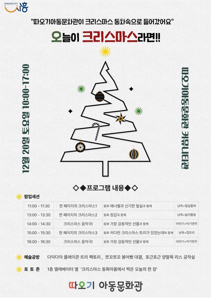 시흥시 따오기아동문화관이 오는 20일 크리스마스 문화행사 ‘오늘이 크리스마스라면’을 연다. 반짝이는 트리, 서늘한 겨울 공기, 책장을 넘기는 소리가 한데 어우러지며 문화관은 잠시 ‘이야기가 살아 움직이는 공간’으로 변한다.