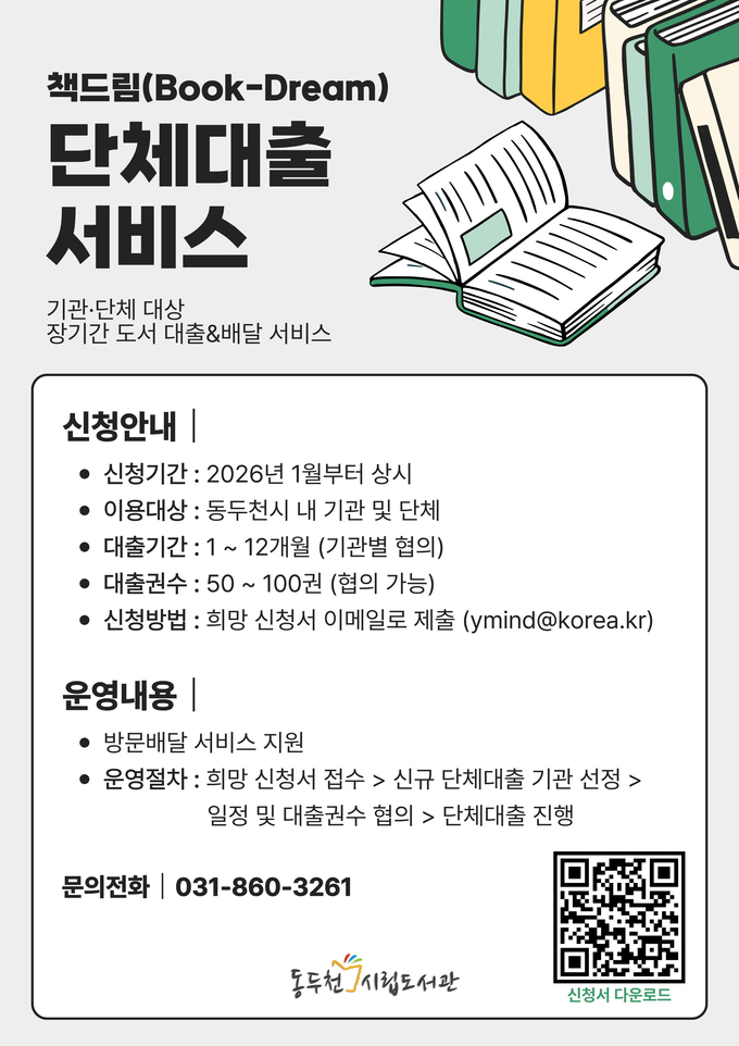 동두천시 도서문화사업소 시립도서관은 지역 독서문화 확산을 위해 관내 기관 및 단체를 대상으로 장기 도서 대출 서비스인 책드림(Book-Dream)을 연중 운영한다.