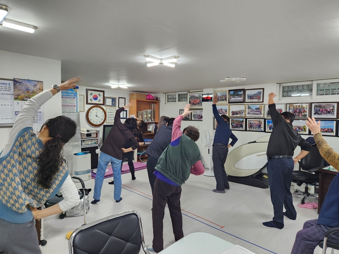 가벼운 스트레칭으로 몸을 푼 뒤 치매 예방을 위한 인지 자극 운동과 건강 교육이 이어진다. 웃음과 대화가 오가며 경로당은 작은 건강 교실로 바뀐다.