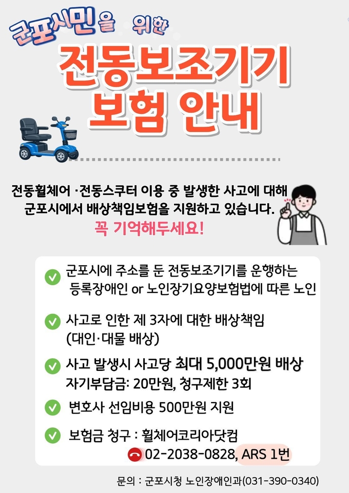 군포시는 전동휠체어와 전동스쿠터 등 전동보조기기를 사용하는 장애인 및 노인장기요양보험법에 따른 노인을 대상으로 배상책임보험을 지원한다.
