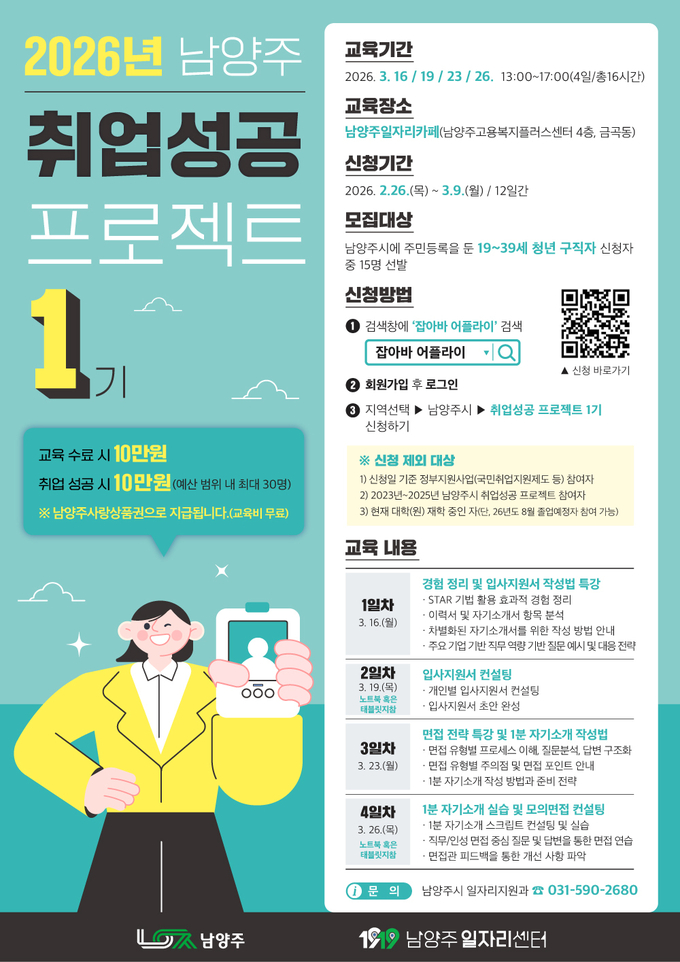 남양주시는 이달 26일부터 청년 구직자의 취업 경잭력 강화를 위해 ‘2026 취업성공 프로젝트 1기’ 참여자를 모집한다고 밝혔다.