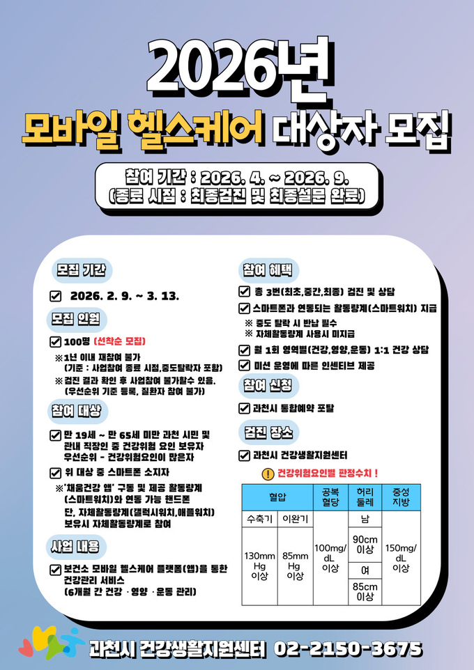 과천시 보건소가 스마트폰과 활동량계를 활용해 맞춤형 건강관리를 지원하는 ‘2026년 모바일 헬스케어 사업’ 참여자를 모집한다.