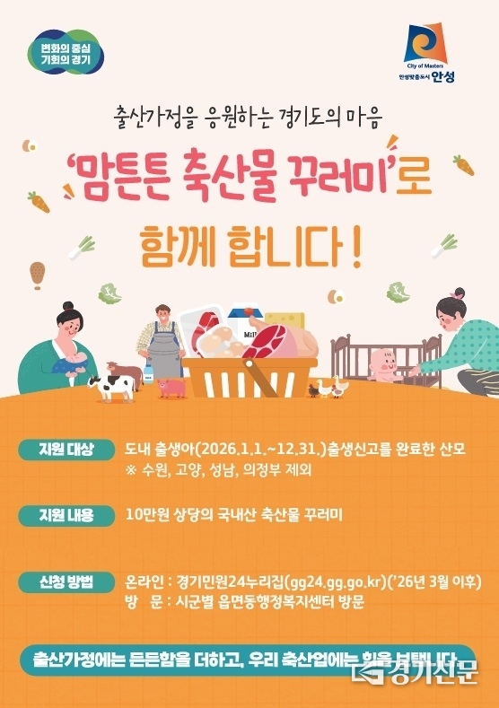 지원 대상은 경기도에 주소를 두고 2026년 1월 1일부터 12월 31일까지 안성시에 자녀 출생신고를 마친 산모로, 1인당 10만 원 상당의 국내산 축산물 꾸러미가 제공된다.