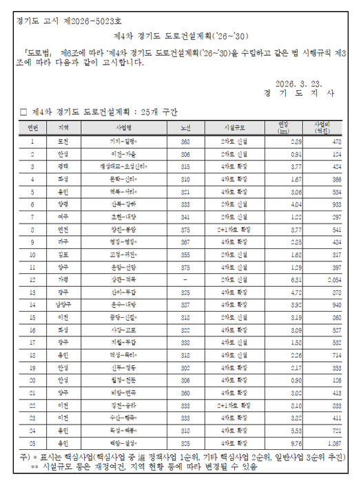 도는 이런 내용을 담은 ‘제4차 경기도 도로건설계획(2026~2030)’을 경기도보에 고시했다고 23일 밝혔다.