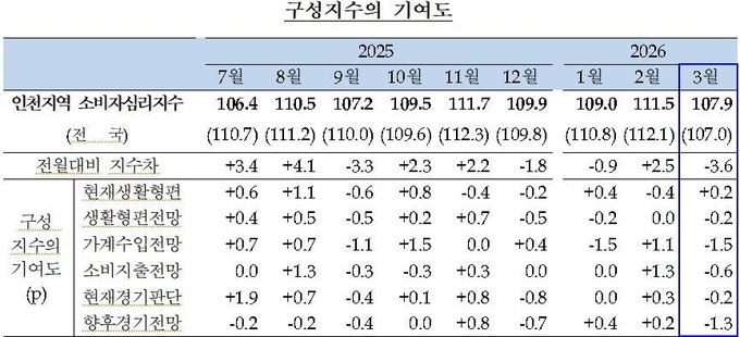 한국은행 인천본부가 지난 3.12일~18일까지 지역 내 400가구를 대상으로 실시한 '소비자심리동향지수(CCSI) 조사' 결과에 따르면, 이달 인천의 소비자심리지수는 전월 대비 3.6p 하락하며 뚜렷한 감소세를 기록했다. 이는 최근 격화된 이란발 전쟁 위기로 인한 원자재 가격 상승과 그에 따른 경기 둔화 우려가 시민들의 경제 활동 심리에 즉각적인 타격을 준 것으로 풀이된다.