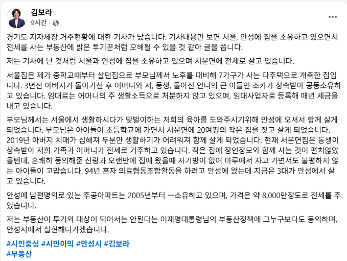 김 시장은 자신의 SNS를 통해 “기사에 언급된 것처럼 서울과 안성에 주택을 소유하고 있고 서운면에 전세로 거주 중인 것은 사실”이라면서도 “이는 투기와는 전혀 무관한 가족사와 생활 여건에서 비롯된 것”이라고 밝혔다.