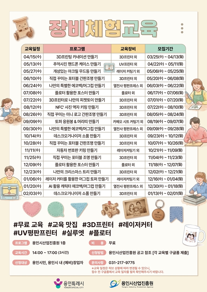 교육은 오는 2027년 2월까지 20회차로 운영되며, 회차당 10명 내외로 소규모로 운영된다. 참가자는 카네이션, 핸드폰 케이스, 무드등, 에코백 등 다양한 생활형 결과물을 제작하며 장비 활용 과정을 자연스럽게 익힐 수 있다. 수강료는 무료이며, 관련 경험이 없어도 누구나 신청 가능하다.