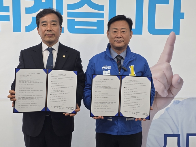 더불어민주당 구리시장 경선 후보였던 신동화 예비후보와 권봉수 예비후보가 14일 신동화 예비후보 선거사무소에서 ‘구리시 혁신과 승리를 위한 공동선언문’발표를 위한 기자회견을 열고, 정책으로 함께하는 책임 있는 공동 연대를 선언했다.