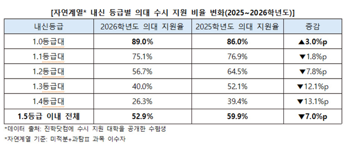 의대 정원이 축소되며 합격 문턱이 높아졌던 2026학년도 수시에서 내신 1.0등급대 최상위권의 의대 쏠림은 오히려 더 강해진 것으로 나타났다.