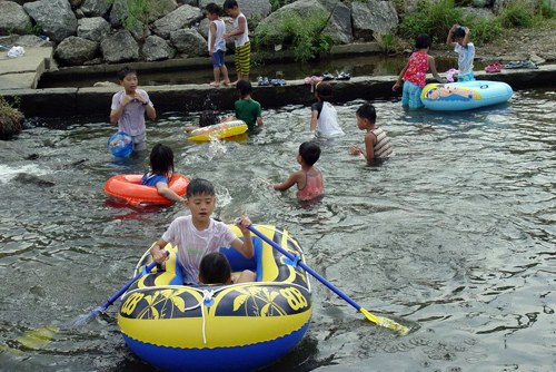 13일 무더위에 견디다 못한 어린이들이 학의천에서 물놀이를 즐기고 있다. 의왕시는 오는 2007년까지 학의천을 환경친화형 대표하천으로 조성하기로 했다.