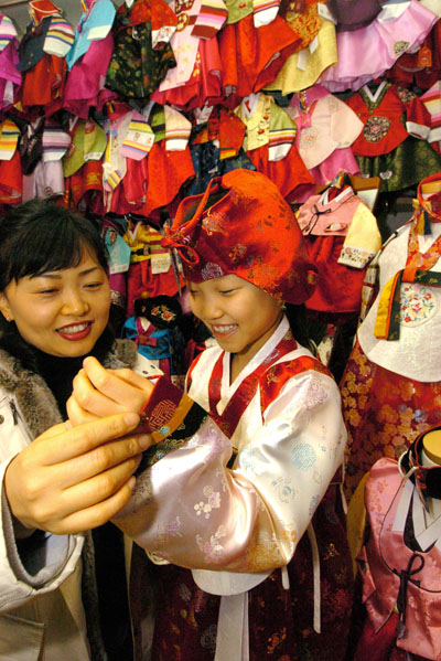 도내 유통업체들이 다가오는 설날을 앞두고 다양한 선물세트와 한복 등을 준비하며 설날 특수 잡기에 여념이 없다. 20일 수원시 영동시장 내 한복매장을 찾은 모녀가 고운 설빔을 입어보며 즐거워하고 있다.