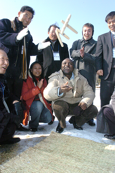 8일 오후 수원 아주대학교 교정에서 열린 경영대학원 총동문회 주최 정월대보름맞이 윷놀이대회에서 외국인 학생들이 윷을 던지며 즐거운 시간을 보내고 있다.