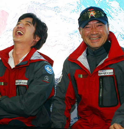25일 서울 신길동의 한 음식점에서 열린 '2006 월드컵 성공기원 한국연예인 히말라야 아일랜드피크(6189m)원정대 발대식'에 참가한 이덕화가 정준호에게 '영화에선 잘하던데 산은 잘타니?'라며 농담을 하며 활짝 웃고 있다.
