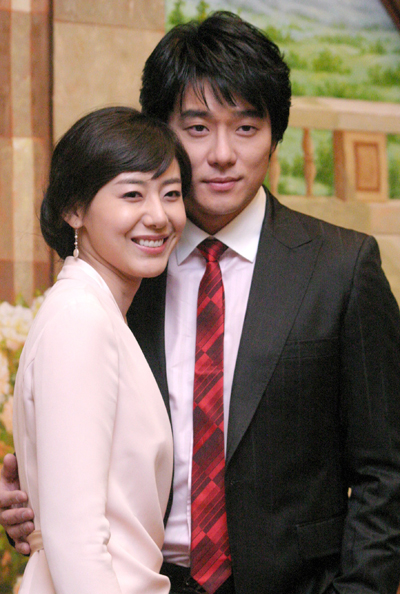 27일 홍은동 스위스 그랜드 호텔에서 열린 SBS드라마 '하늘이시여'의 왕모&자경 커플 결혼식 현장 공개'에서 '이자경' 역의 윤정희(왼쪽)와 '구왕모' 역의 이태곤이 다정히 포즈를 취하고 있다.