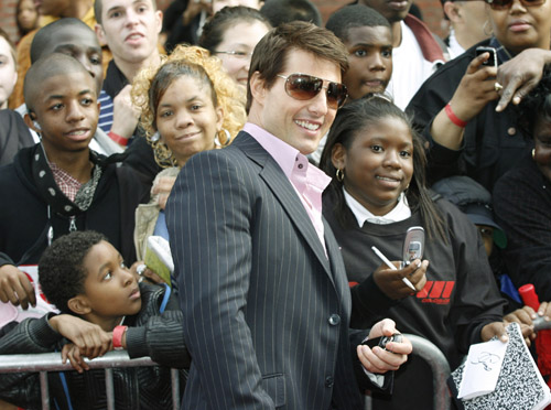 자신이 출연한 영화 `미션임파서블3' 상영회에 참석하기 위해 도착한 톰 크루즈가 3일 뉴욕 할렘에서 팬들과 포즈를 취하고 있다.<연합>