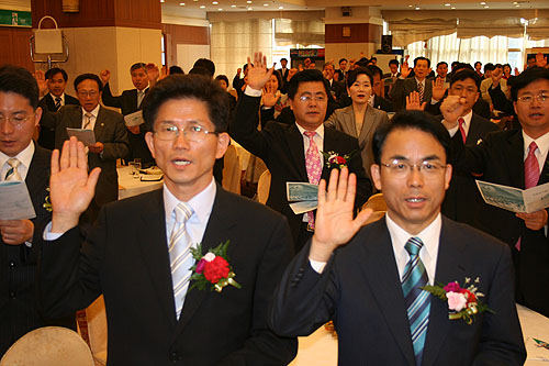 5.31 지방선거에서 경기지사 후보로 출마한 열린우리당 진대제 후보와 한나라당 김문수 후보가 8일 수원 리젠시 호텔에서 열린 '공명선거를 위한 조찬 기도회'에 참석해 깨끗한 정책선거를 다짐하고 있다.