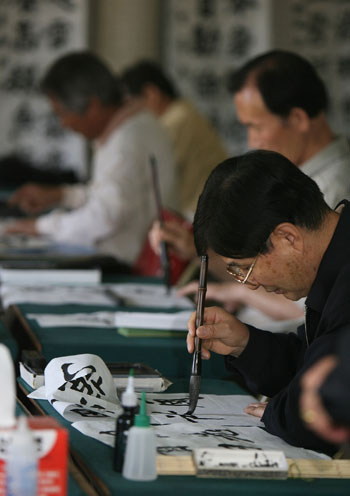 수원 향교에서 운영하는 노인대학이 지역내 황혼의 노인들의 배움터로 인기를 얻고 있다. 8일 수원향교를 찾은 노인들이 붓글씨를 배우느라 여념이 없다.