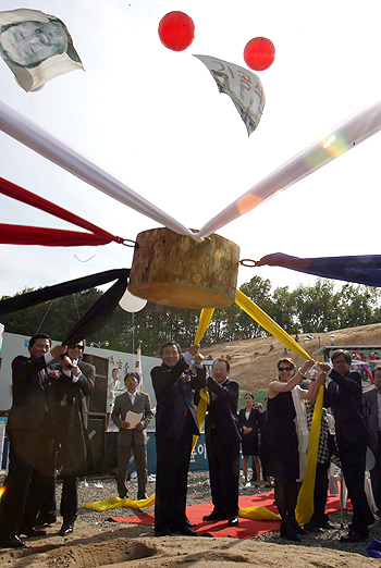 9일 용인시 상갈근린공원내에서 열린 백남준 미술관 준공식에 참가한 내외빈들이 '터다짐' 퍼포먼스를 하고 있다.