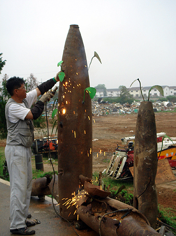 22일 오후 미군기지 이전 예정지인 평택시 팽성읍 대추분교 인근에서 설치미술가 최병수(46)씨가 폐 포탄과 호미를 이용해 구상한 평화상징 조형물 '생명, 그리고 희망'이란 작품 설치작업을 하고 있다. /연합