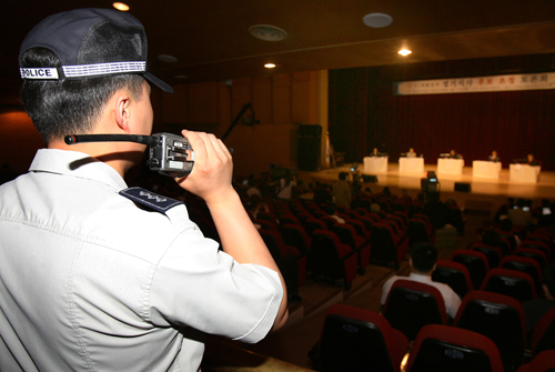 지방선거 출마 후보자에 대한 경호가 강화된 가운데 23일 수원청소년문화센터에서 열린 경기지사 초청 토론회장에 경찰이 경비를 서고 있다.