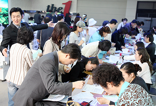 동탄신도시 인근 민간 임대아파트 1순위 분양 첫날인 22일 동수원사거리의 주택전시관이 분양을 받기 위해 찾은 시민들로 북적이고 있다.