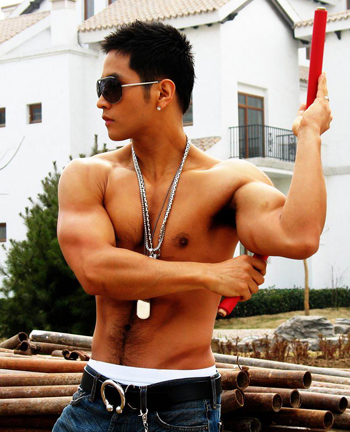 중국에 중국어로 된 음반을 발매하는 가수 유승준이 근육질의 몸매를 자랑하며 쌍절곤을 돌리고 있다.
