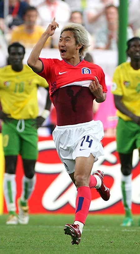 후반 9분, 이천수가 절묘한 프리킥으로 동점을 만든 후 환호하며 관중들을 향해 달려가고 있다.