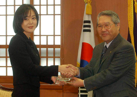 최성홍 외교부장관이 28일 오후 외교부에서 지난해 한일 국민교류의 해 친선사절로 활동했던 영화배우 김윤진씨에게 감사패를 수여하고 있다.