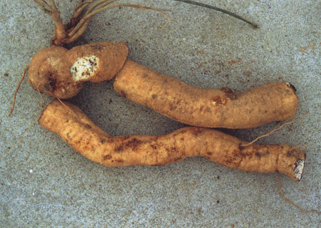 중부이남의 야산과 들판에 분포하며 뿌리를 식요한다.