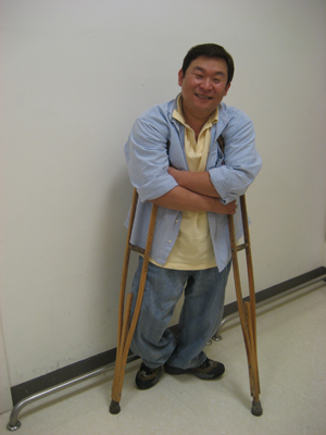 김 연출가는 태어난지 100일때부터 소아마비로 불편한 양 다리를 목발에 의지하며 살아왔다.
