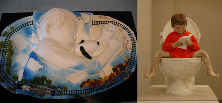 어른 엄지손가락를 쥐는 작은 아기손, 고요히 잠든 모습, 변기 위에서 책읽는 아이, 남편을 떠나보낸 엄마의 뒷모습 등 한장의 사진같은 일상을 세라믹 부조와 조각 작품으로 표현했다.