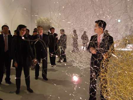 27일 안산시 경기도미술관에서 열린 조각프로젝트 ‘공간을 치다 Lines in Space’ 행사에서 김문수도지사와 이정남 경기신문 부사장등 참석자들이‘빛’ 작품을 관람하고 있다. /류설아기자 rsa@