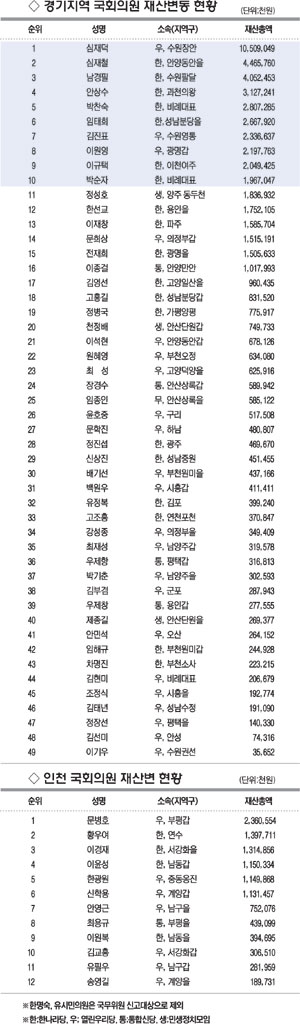 재산 상위 10위에는 인천의 문병호 의원을 제외하고는 경기지역 의원들이 독차지했다. 정당별로는 한나라당이 7명, 열린우리당이 3명이다.