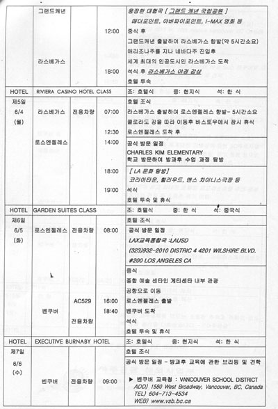 이에 대해 교육청 관계자는 “이번 일정은 교육청에서 지정한 미국과 캐나다의 교육기관에 맞춰 여행사에서 짠 것이어서 라플린이나 라스베거스가 일정에 포함된 것을 뒤늦게 알았다”며 “프레즈노, 바스토우, 빅토리아 시 등을 방문하는 것은 방문국의 문화 등을 익히기 위한 것”이라고 밝혔다.
