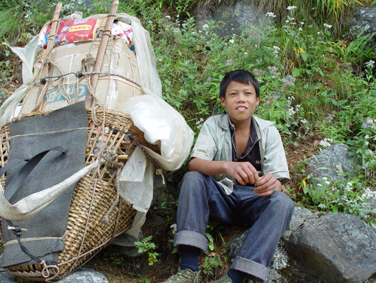 워낙 무겁게 메고 다녀서 이마에 굳은살이 박이고 목이 부러지지 않을지 걱정스러운데, 여인들이나 아이들도 신기하게 잘 다닌다. 어려서부터 히말라야의 산중에서 살면서 힘든 밭일과 땔감 구하는 일을 해서 단련이 되었나 보다. 세워 둔 것을 시험 삼아 이마로 들어보았더니 도저히 들 수 없는 무게다.