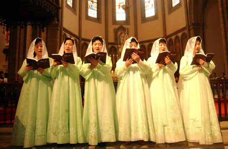 남북종교인 3.1민족대회차 참석한 북측 평양 장충성당 신도들이 2일 오전 명동성당에서 열린 남북 합동미사에서 성가를 부르고있다.