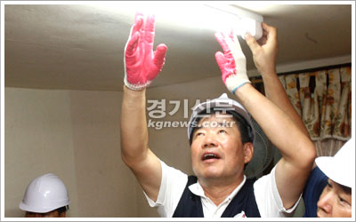김진표 의원이 26일 수원 매탄2동에서 저소득층을 대상으로 오래된 형광등, 소켓, 안정기 등의 조명기기를 전기가 절약되는 고효율 형광등으로 교체하여 주고 있다. 한국전력공사에서 에너지 절약을 위하여 저소득층