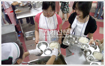 도가 올해 2학기부터 도 전역의 학교급식에 1등급 최우수 축산물을 공급하기로 했다. 26일 과천 한국마사회 컨벤션센터에서 열린 ‘경기도 우수축산물 시식회’에서 참가자들이 1등급 한우와 돼지고기를 배식받고 있